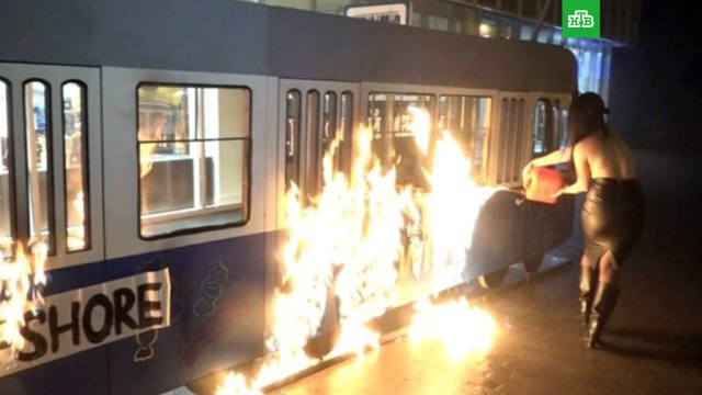 Активистка с оголенной грудью подожгла декоративный трамвайный вагончик, стоявший перед входом в лавку. Пожар был устроен в знак протеста против финансовых афер президента Украины Петра Порошенко.