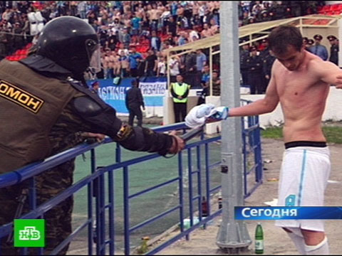 Андрей Шмонин, заместитель начальника полиции общественной безопасности ГУВД Нижегородской области: «Никто никого не ударил. Там ситуация такая: игрок бежит в сторону болельщиков, ОМОНовец его просто останавливает рукой, и все. Никто никого не ударил».