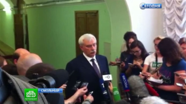 В эти минуты губернатор встречается с журналистами в Смольном. Как сообщает корреспондент НТВ Александр Щерба, решение о досрочной отставке стало главной политической интригой. Глава города вышел к прессе явно в хорошем расположении духа, улыбался.
