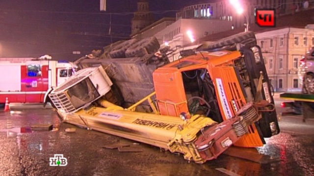 Пожарные, спасатели и кареты «скорой» примчались на помощь водителю крана «Ивановец», который опрокинулся на дороге в центре Москвы.