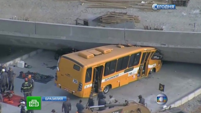 Напомним, что один из пролетов виадука рухнул на автотрассу ярусом ниже. Бетонная конструкция накрыла автомобиль и смяла переднюю часть салона автобуса.Эстакада рухнула на автобус и автомобили в бразильском <nobr>Белу-Оризонти</nobr>