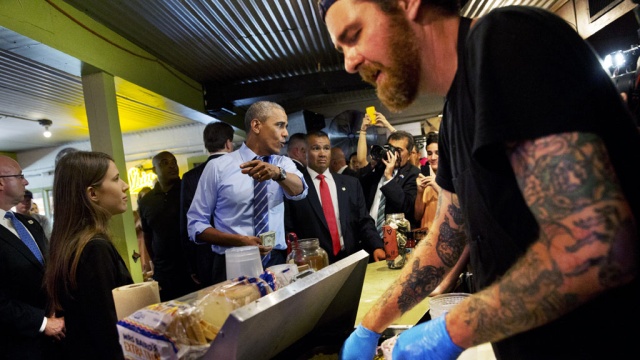 После выступления в техасском Остине президент США Барак Обама неожиданно совершил визит в один из местных ресторанов быстрого питания. Там он решил угостить ланчем всех, кто стоял в очереди.