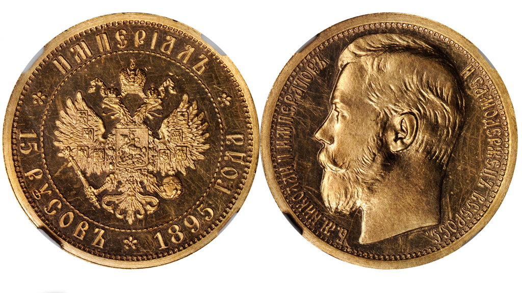 В США на аукцион выставлена отчеканенная на Санкт-Петербургском монетном дворе в 1895 году серия пробных золотых монет номиналом 15 русов, 10 русов и 5 русов.