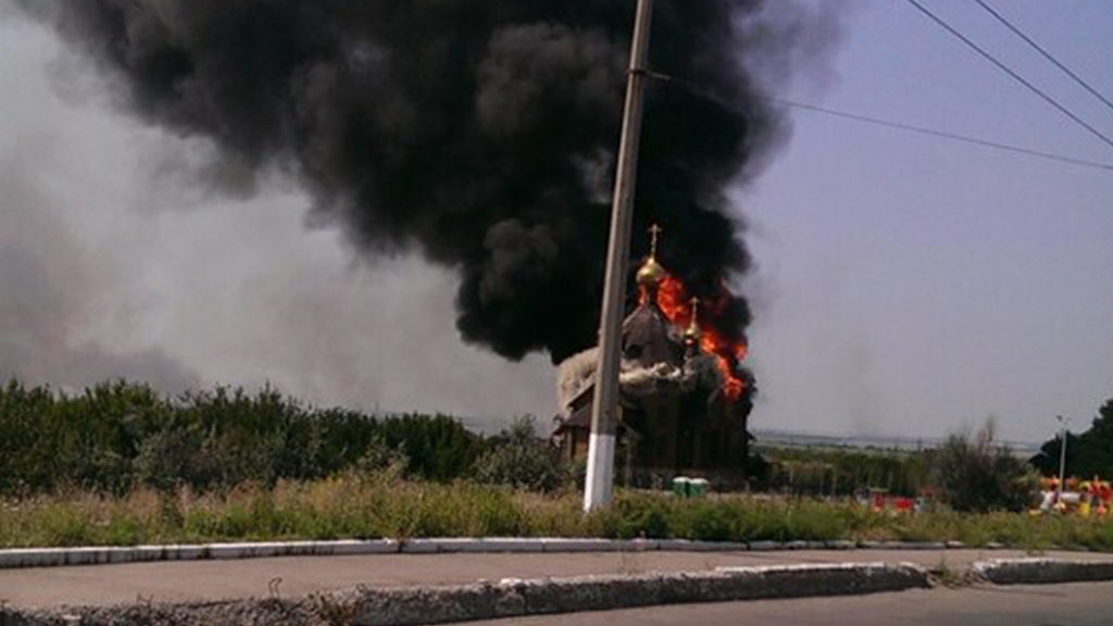 В Горловской епархии сообщили, что Благовещенский храм, находившийся в микрорайоне «Строитель», полностью сгорел. Никто из сотрудников храма и прихожан не погиб, но в микрорайоне бушует еще несколько пожаров.