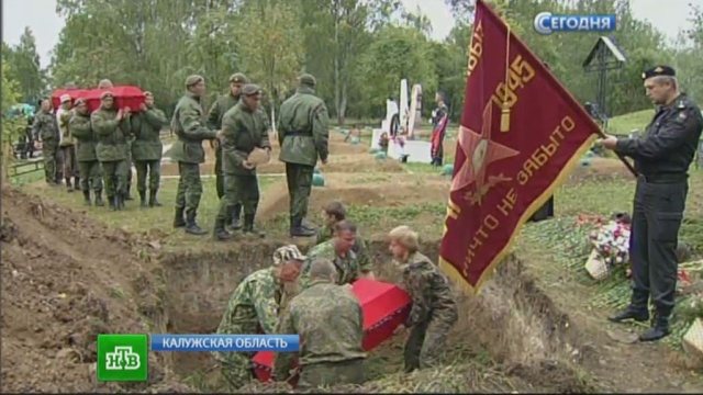 В Калужской области сегодня торжественно перезахоронили останки 130 советских воинов, погибших во время Великой Отечественной в районе Зайцевой Горы. Кровопролитные бои за стратегическую высоту шли целый год. Спустя семь десятилетий раскопки там провели участники крупнейшей за последние годы «Вахты памяти», на которую съехались более 200 поисковиков со всего бывшего СССР.