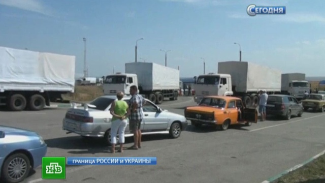 Сегодня после полудня российский МИД сообщил, что официальный Киев затягивает поставку гуманитарной помощи наКак передает корреспондент НТВ Святослав Гордин, КамАЗы, прошедшие досмотр, сейчас небольшими колоннами по