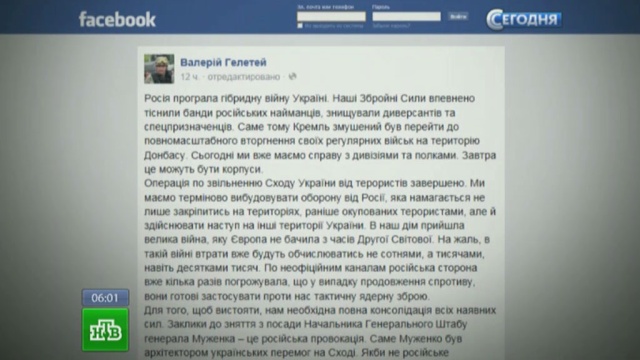 Гелетей накануне на своей странице в Facebook заявил: на Украину пришла большая война, сравнимая со Второй мировой, и страна должна «выстраивать оборону от России», а также готовиться к десяткам тысяч жертв. Притом, пошел дальше Гелетей, по неким его неофициальным данным, Россия может применить на Украине тактическое ядерное оружие. Этот пассаж заставил дипломатов отметить: к вменяемости автора могут быть вопросы.