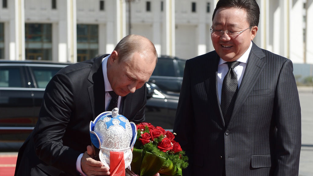 Президента РФ Владимира Путина встретили в Монголии цветами.