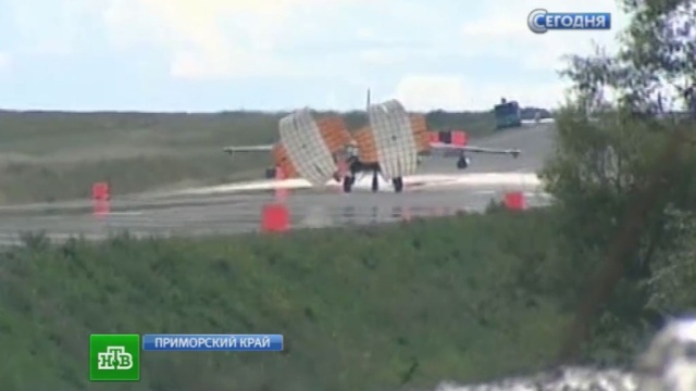 Пилоты покинули истребитель после того, как при посадке у него не вышла правая стойка шасси.
