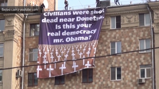 В центре Москвы появился плакат с крестами и одним вопросом, адресованным президенту США Бараку Обаме. Большой баннер был вывешен на доме №18 по Новинскому бульвару, прямо напротив американского посольства. На коричневом фоне были изображены многочисленные белые могильные кресты и надпись на английском языке: «Расстрелянные мирные жители под Донецком. Это и есть твоя настоящая демократия, мистер Обама?».