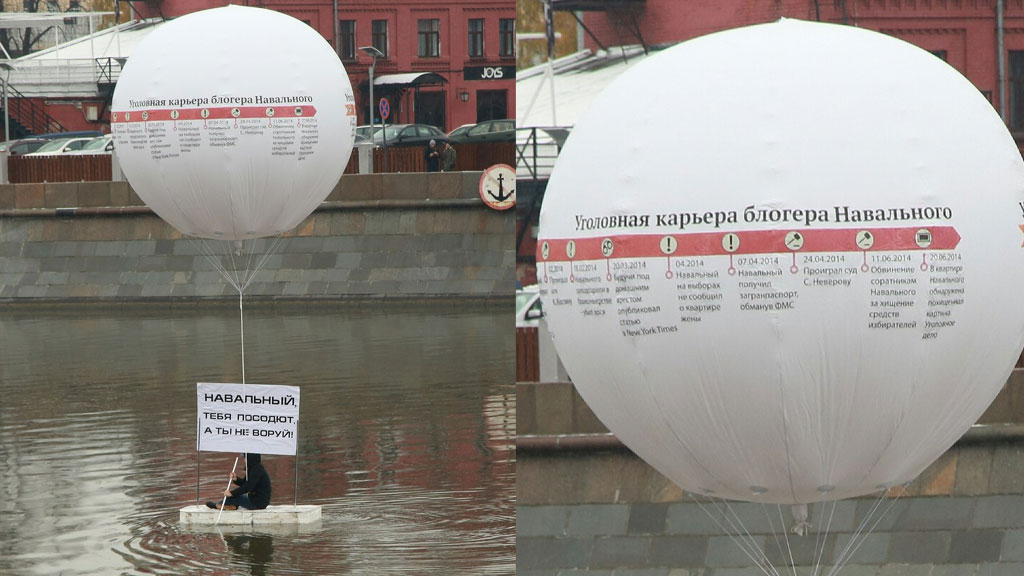 К плоту был прикреплен большой воздушный шар с надписью «Уголовная карьера Навального». К нему же была прикреплена табличка: «Навальный, тебя посодют, а ты не воруй» — переделанная фраза из советского кинофильма «Берегись автомобиля».