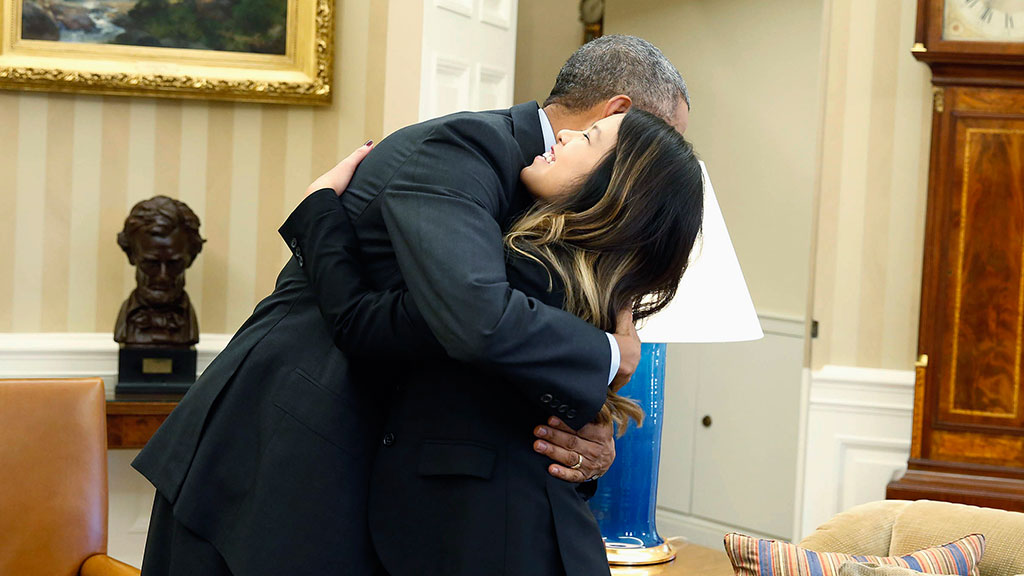 Обама и Фэм встретились в Овальном кабинете Белого дома, куда прессу не пустили. Президент и медсестра несколько минут постояли перед камерами, прежде чем двери за ними захлопнулись.