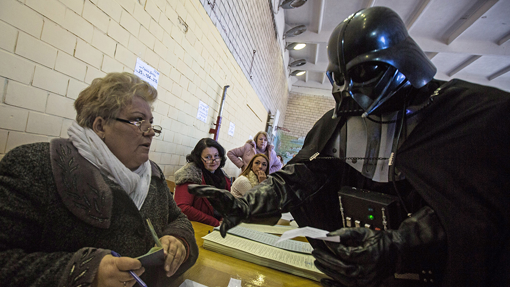 Один из самых колоритных участников парламентских выборов на Украине Дарт Вейдер устроил сегодня скандал на избирательном участке.