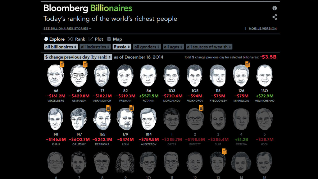 Bloomberg Billionaires Index подсчитало, сколько денег потеряли российские миллиардеры с начала этой недели. Как выяснилось, 20 богатейших граждан РФ за последние три дня обеднели на 10 млрд долларов.