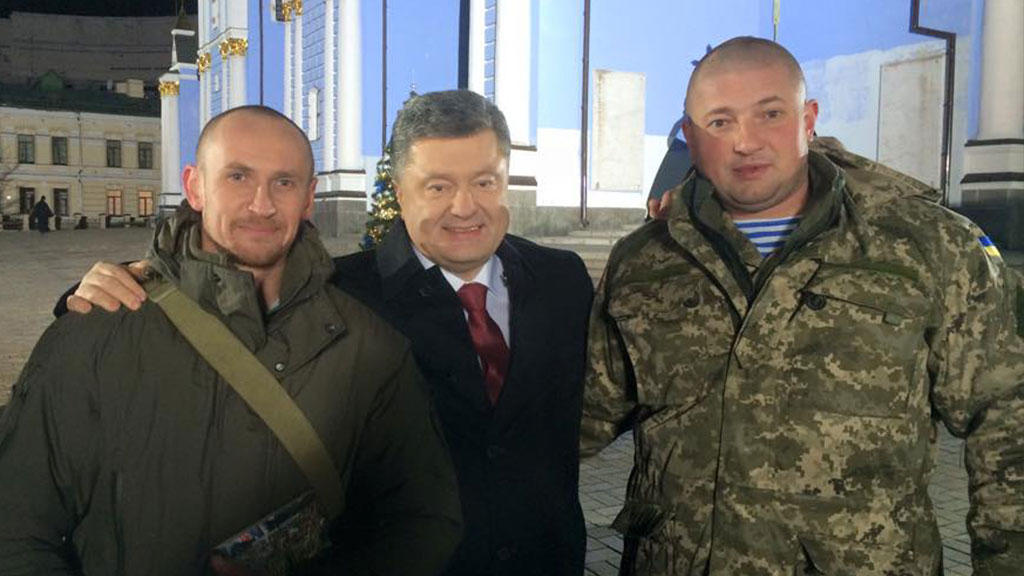 Судя по фотографиям со съемочной площадки, которые выложил в своем Facebook глава украинского фонда «Крылья Феникса» Юрий Бирюков, поздравительную речь Порошенко произносил, стоя рядом с военными.