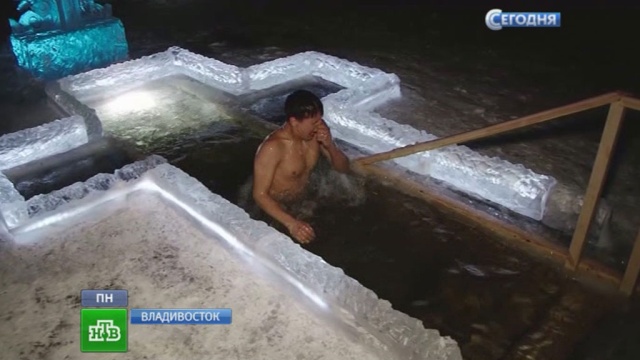 Патриарх Кирилл проведет сегодня в московском Богоявленском соборе в Елохове торжественную литургию. Накануне в православных храмах начали освящать воду, а верующие, по традиции, отправились купаться. Во Владивостоке в этом году к прорубям выстраивались очереди, а многие использовали в качестве купели Японское море.