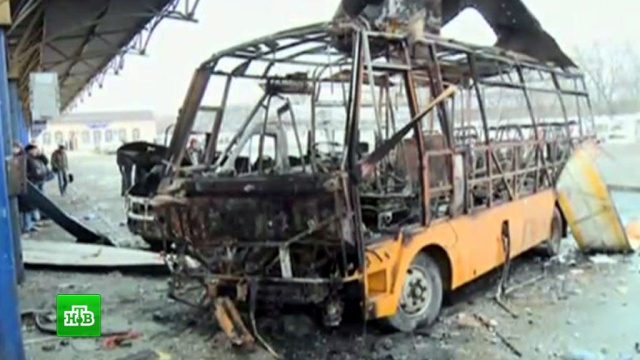 Взрывы на автобусной остановке в центре Донецка прогремели в 8 утра именно в это время люди уезжают на работу. Снаряды уничтожили два автобуса, пробили кровлю пассажирского терминала. На месте ЧП валяются куски бетонной стены.