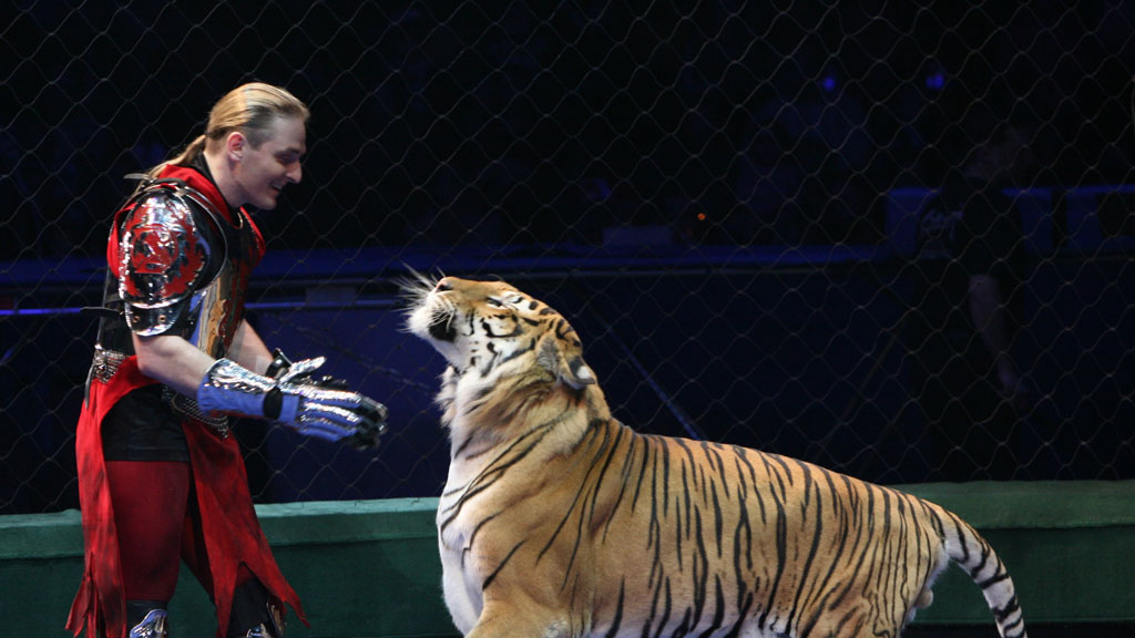Опытный дрессировщик Аскольд схватил за голову хищницу и удерживал Шакиру (имя тигрицы)