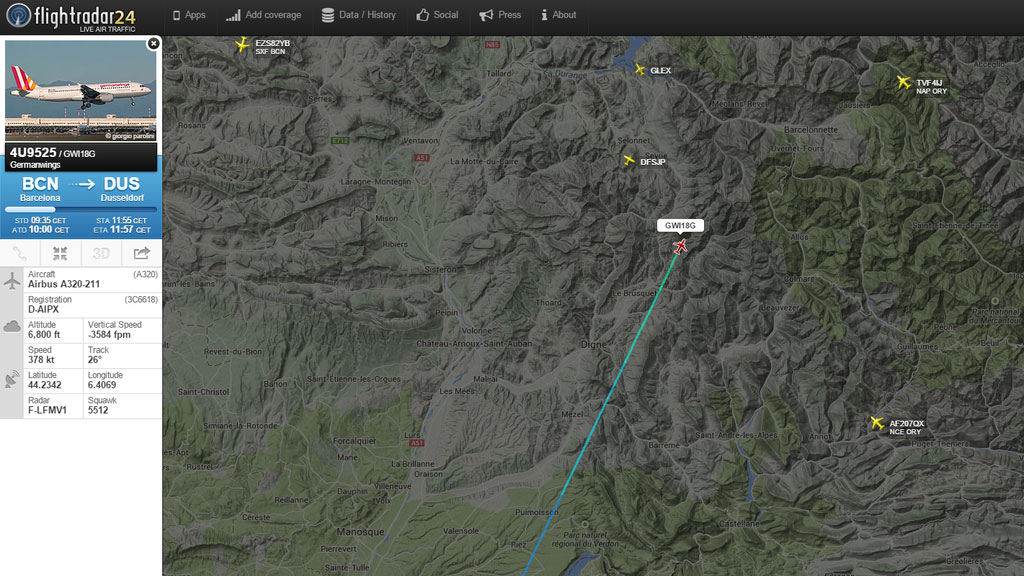 Обломки самолета A-320 , потерпевшего крушение на пути из Барселоны в Дюссельдорф, обнаружены рядом с городом Барселоннет. Спасатели пока не могут добраться до места ЧП.