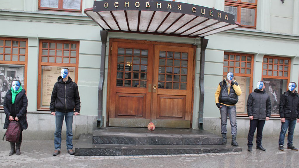 Кроме того, протестующие устроили целое представление — человек в костюме смерти с косой срывал со своих товарищей маски и швырял их об стену МХТ. А в конце все участники акции стали скандировать: «Россия без богохульства!».
