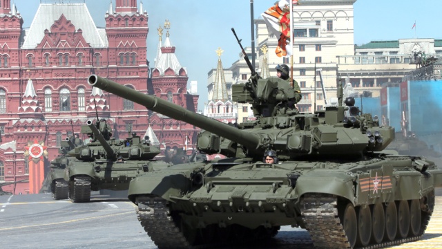 Приблизительно в середине Тверской находятся тяжелые боевые машины и танки на платформе «Армата», а также танки