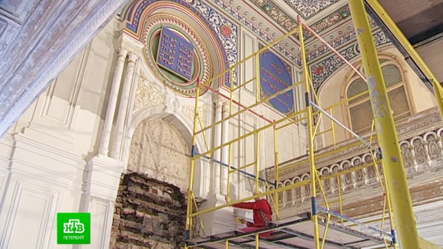 Как отмечает корреспондент НТВ Антон Зыков, во время многочисленных ремонтов многие элементы были покрыты краской в шесть и даже восемь слоев. А одну из частей, например, бронзировали. То есть поверх старого сусального золота наносили похожую по цвету бронзовую краску. С годами она настолько сильно впиталась в дерево, что очищали его до основания. Но если приглядеться, то частички сусального золота
