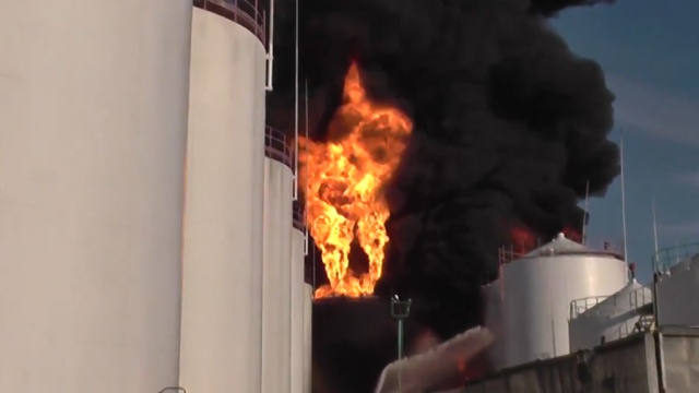 Тем временем пожарным не удается остановить распространение огня на полыхающей нефтебазе. Огнем охвачен весь объект, пламя вплотную подобралось к соседней нефтебазе.