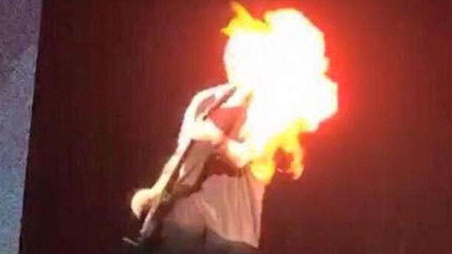 Гитарист Майкл Клиффорд прошел слишком близко от пиротехнической установки, и пламя ему опалило голову и футболку.