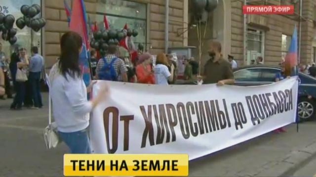 «Союз политэмигрантов и политзаключенных Украины» у дверей американского посольства устроил митинг против внешней политики Соединенных Штатов. На акцию пришли люди со связками черных шаров и плакатами. Собравшиеся проводят параллель между хиросимской трагедией и событиями на Украине.