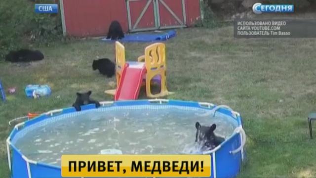 В американском штате Нью-Джерси медведица с детенышами, спасаясь от жары, залезли на территорию частного особняка и решили отдохнуть у бассейна. Хозяева не стали прогонять незваных гостей, заперлись в доме и снимали происходящее на камеру.
