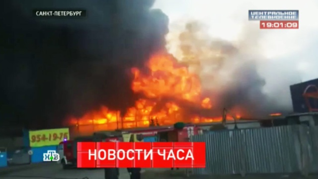 Пожарные продолжают борьбу с огнем в Выборгском районе Петербурге. Площадь возгорания увеличилась до 10 тысяч кв. метров. Произошло обрушение кровли горящего склада. Пожару присвоен