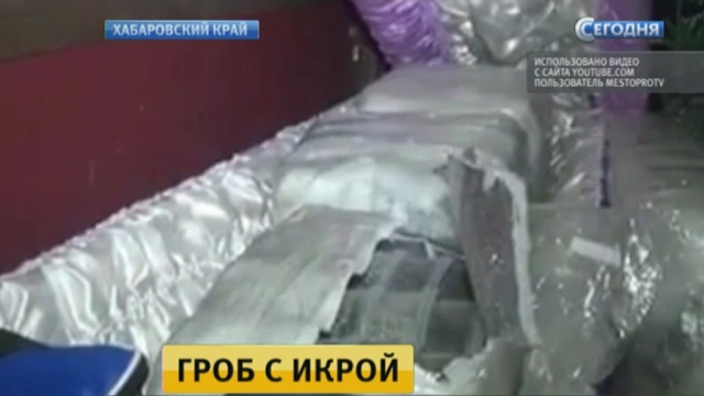 На лобовом стекле — фотография с траурной лентой, внутри — гроб и венки. Водитель сообщил, что перевозит тело в один из хабаровских моргов, однако свидетельства о смерти у него не было. Сотрудники полиции осмотрели салон и под траурными венками нашли сумки с черной икрой. Прибыла
