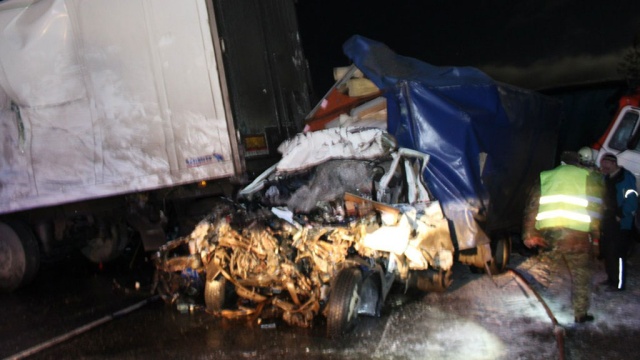Как сообщили в соцсетях очевидцы, несколько фур с прицепами от удара развернуло поперек дороги, а грузовую «Газель» буквально смяло в лепешку.