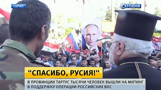 Как передает корреспондент НТВ Алексей Ивлиев, все окраины Тартуса опустели. Все население города пришло в центр для того, чтобы принять участие в митинге в поддержку действий российской авиации в Сирии. Очень необычный митинг: никаких официальных речей. Люди подходили к журналистам, обнимали их и на ломаном русском постоянно звучало «Спасибо, Русия!». Здесь огромное количество тех, кто учился