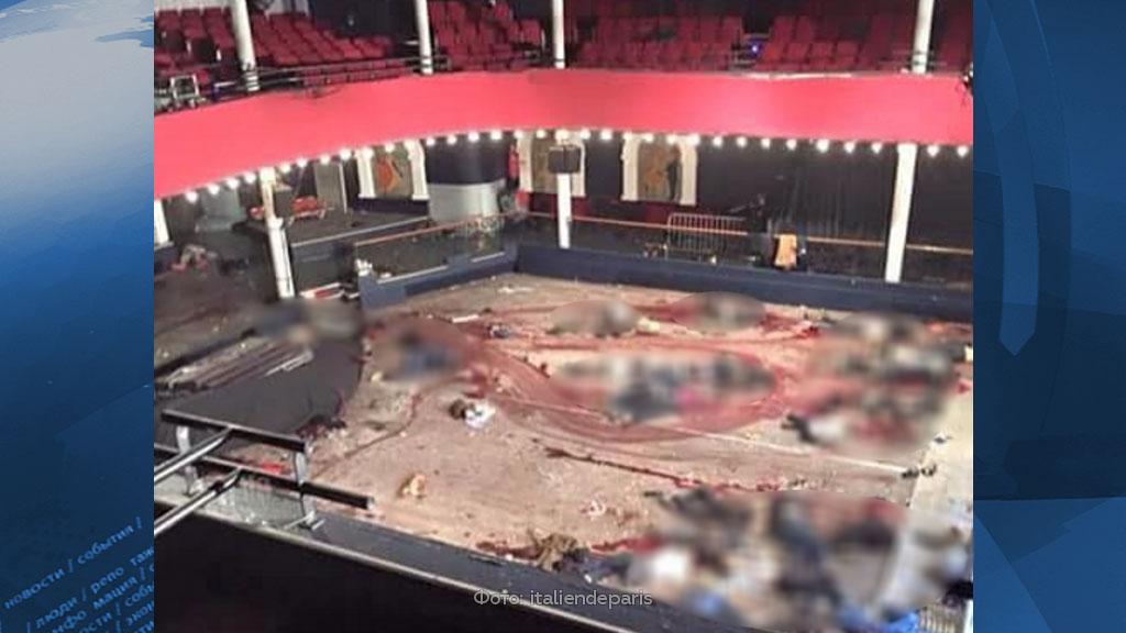 В социальных сетях появился снимок, сделанный сразу после террористической атаки на театр «Батаклан». На изображении десятки окровавленных тел, которые лежат на полу в центре зала.