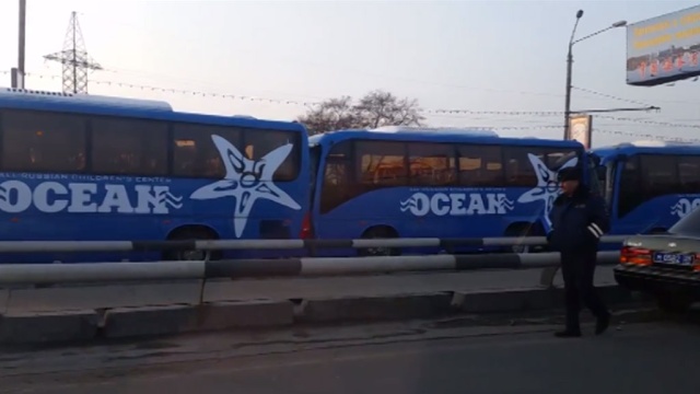 Авария произошла сегодня утром в районе Некрасовского путепровода. Там столкнулись пять автобусов. Все они перевозили школьников из детского центра «Океан» на экскурсию.