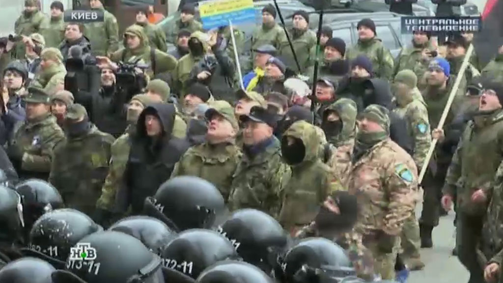 Члены группировки «Радикальные правые силы», среди которых есть и выходцы из «Правого сектора» (организация запрещена в РФ), заперлись в актовом зале гостиницы, которая находится на Площади Независимости, и стали обсуждать свои дальнейшие действия.