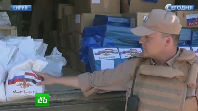 Представитель Центра по примирению враждующих сторон в Сирии: «В очередной раз российские военные привезли гуманитарную помощь в населенный пункт Джабрия. Всего доставили 2,5 тонны индивидуальных рационов питания, сладких подарков и полторы тонны хлеба. Речь идет о лепешках, которые изготовлены из муки, привезенной из Подольска».