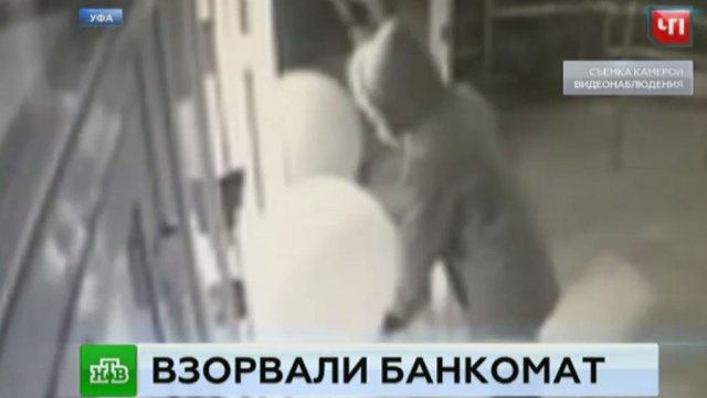 Видно, как в капюшоне, маске и с двумя воздушными шарами — как потом стало понятно, они были наполнены воспламеняемым газом — он входит в финансовое учреждение. Затем покидает его. А через несколько секунд двери выбивает мощной взрывной волной. Преступник, забрав деньги, скрывается.