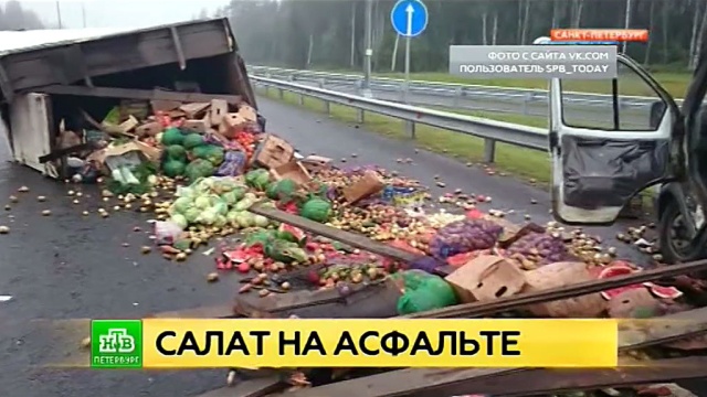 На Новоприозерском шоссе в Ленинградской области грузовик рассыпал овощи и фрукты. Авария произошла сегодня в районе съезда на Орехово. Машина въехала в отбойник, после чего буквально развалилась и потеряла кузов.