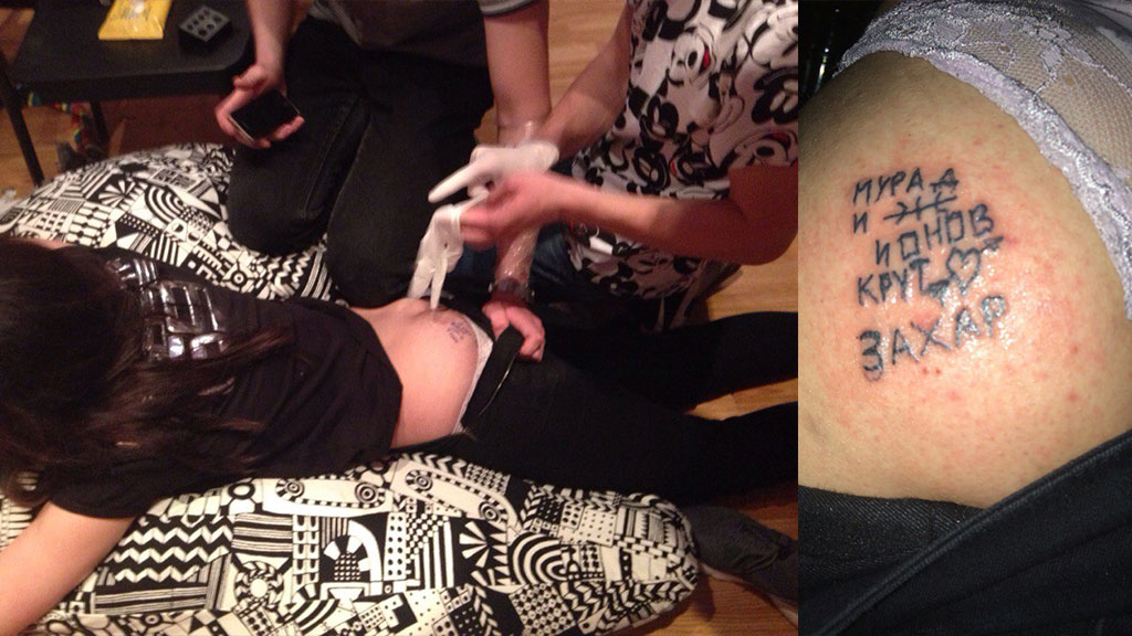 Молодые люди во время совместного отдыха с девушкой набили на ее ягодице татуировку со своими именами.