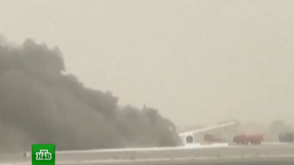 Boeing 777 совершил жесткую посадку в международном аэропорту Дубая 3 августа в 12:45 по местному времени. После удара о взлетную полосу лайнер завалился на бок и загорелся. Очевидцы сняли на видео момент остановки дымящегося самолета, а также взрыв, который произошел на его борту вскоре после посадки.