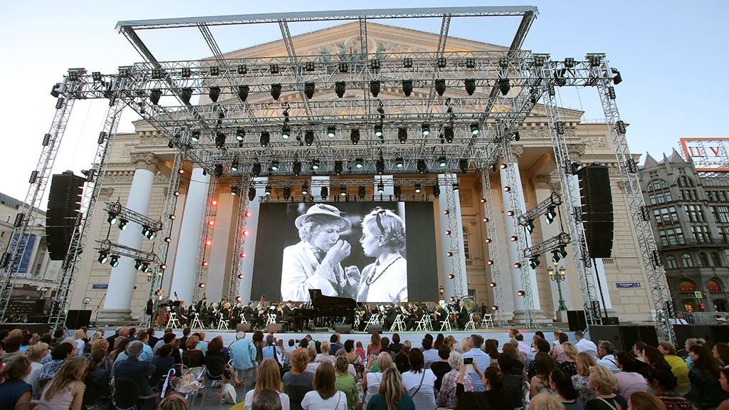 Выступление артистов у Большого театра сопровождалось кадрами из российских фильмов, в том числе «Свой среди чужих, чужой среди своих», «Сталкер», «Земля Санникова», «Ирония судьбы, или С легким паром!», «Асса», «17 мгновений весны» и «Бриллиантовая рука». Для завершения вечера на Театральной площади выбрали картины «Легенда №17» и «Броненосец „Потёмкин“».