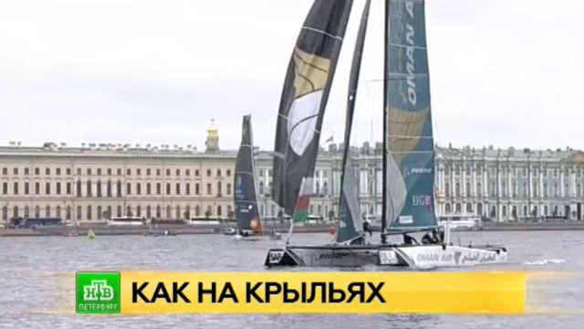 Всё это делают участники престижной серии парусных гонок Extreme Sailing Series. Они проходят в Петербурге уже в третий раз, и, как говорят организаторы, сегодня зрители могут увидеть на Неве самых умелых спортсменов, которым приходится особенно непросто при управлении новой техникой.