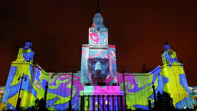 На фасаде главного здания МГУ на Воробьёвых горах устроили настоящий спектакль. Высотка буквально ожила с помощью динамичных изображений красного, голубого, белого,