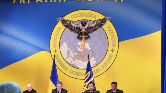 Эмблема украинской разведки с совой, пронзающей мечом Россию, попала в объективы фотокамер во время встречи Петра Порошенко с сотрудниками главного разведуправления страны.