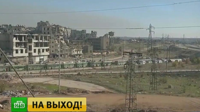 Колонна из 25 автобусов с семьями боевиков и кареты «скорой помощи» с ранеными выехали из Алеппо. Трансляция эвакуации идет на сайте Минобороны России.