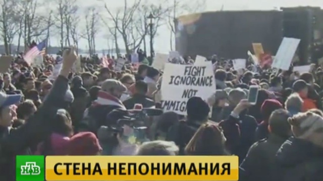 Демонстранты скандируют «Беженцев здесь приветствуют!» и требуют от властей выполнять положения конституции. Протесты против Трампа обострились накануне после подписания им указа об ужесточении приема беженцев в страну. Закон подразумевает временный запрет на въезд в США гражданам семи стран, где живут в основном мусульмане.