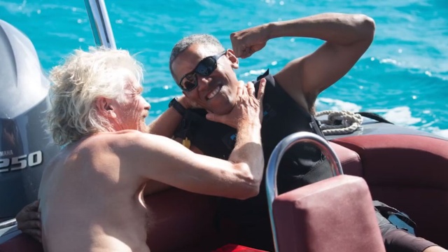 Обама пытался кататься на доске с воздушным змеем, Брэнсон — на обычной. В последний день каникул друзья устроили соревнование: победил Обама, он преодолел