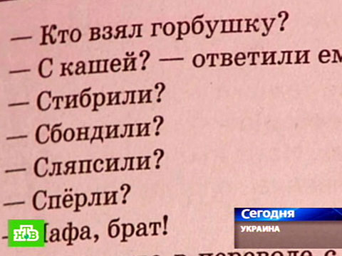 По мнению киевских чиновников, для того чтобы научиться грамотно писать и говорить на великом и могучем, ученики русских школ должны изучить лексику сленга, а также воровской и уголовный жаргон. Для лучшего запоминания в упражнениях рядом дается перевод на литературный язык: «позагорбить — забыть, ухалить — умереть».